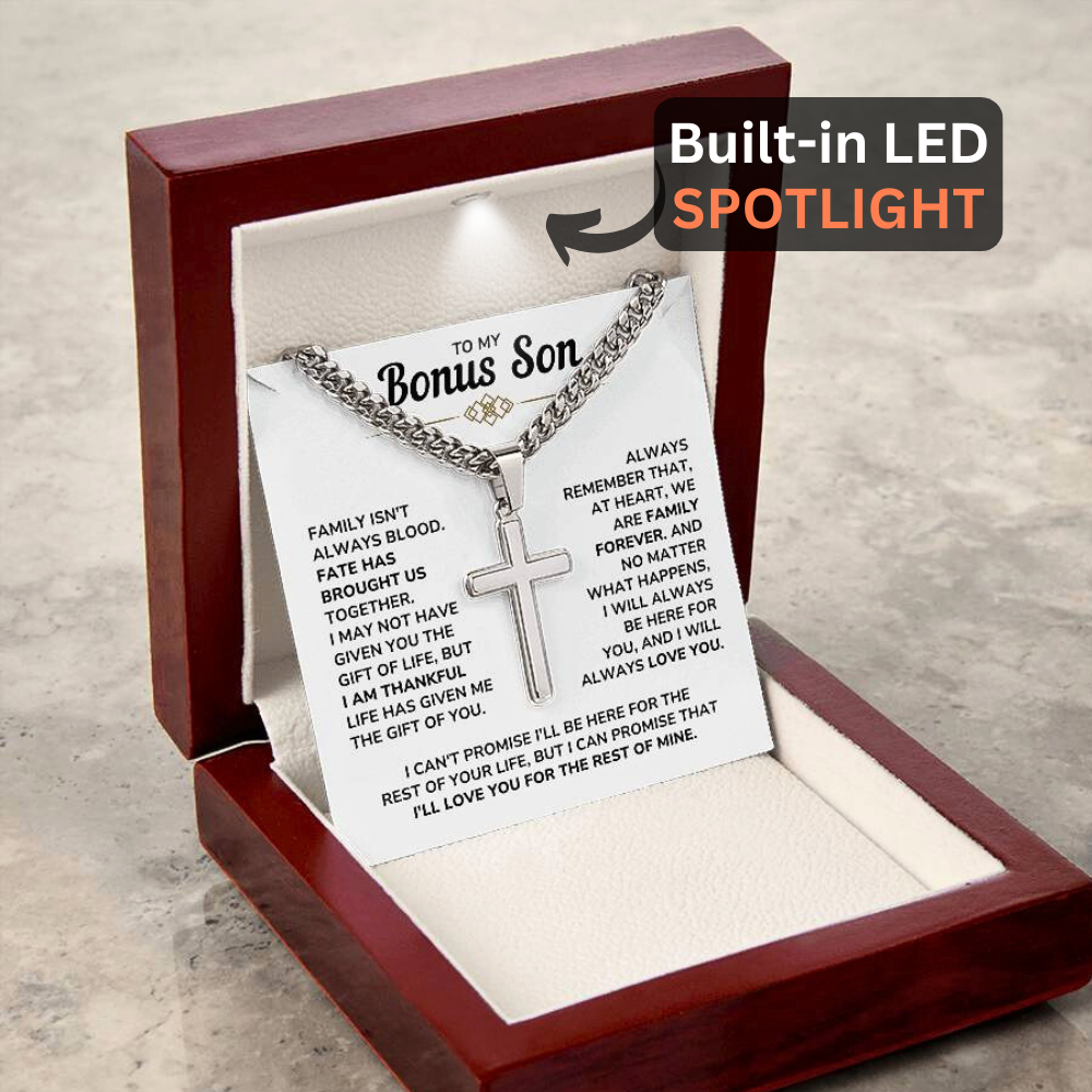 To My Bonus Son - "My Family Forever" Artisan Cross Cuban Link Chain Gift Set – BS01